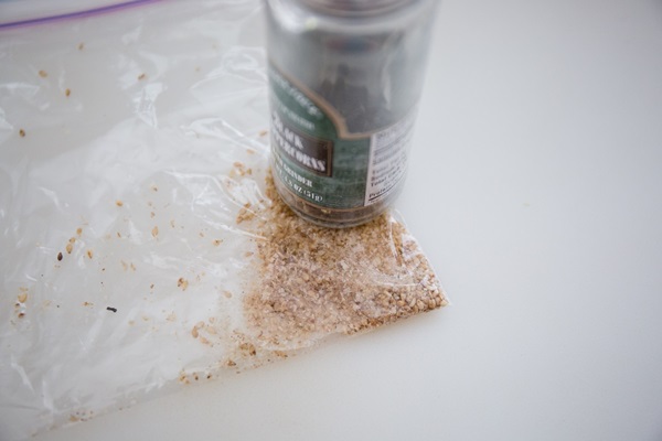 4. 白芝麻放到塑膠袋裡,用瓶子或擀麵棍碾碎,再將磨碎的白芝麻撒在豆漿拿鐵上