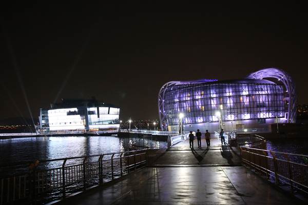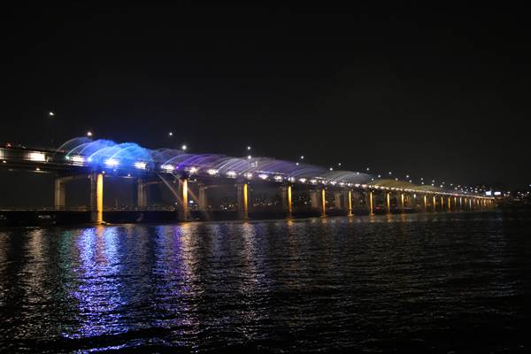 盤浦大橋每年春秋天都會有彩虹月光噴泉,2014年還先建置了人工三島,眼尖的你一定發現了這是電影《復仇者聯盟2》中趙博士的高科技實驗室,入夜後美麗耀眼的光影非常浪漫,彩虹月光噴泉的表演時間如下,千萬別錯過囉!