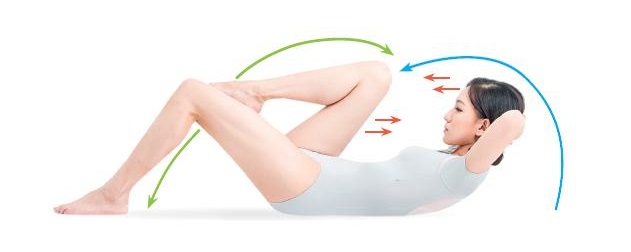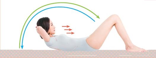 仰躺,屈膝,雙腳微微張開,雙手放在頭後。手肘張開貼地。
