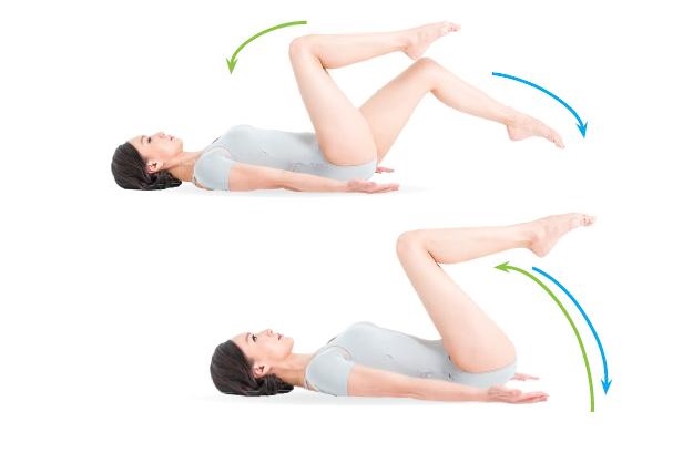 - 吸氣時將兩腳膝蓋拉至胸前,吐氣時將膝蓋放下,足尖點地。重複八次。