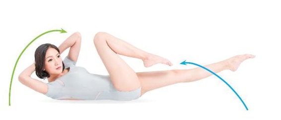 - 右膝與左肩同時拉起、拉近,在此同時,將另一隻腳微微抬高離地。膝蓋與肩膀靠近時吐氣,換腳時吸氣。