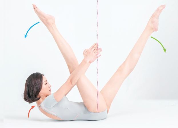 仰躺,雙腳併攏伸直,往上垂直抬高。雙手朝雙腳伸長,上半身抬高。動作