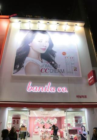 banila co. 粉紅色的招牌跟店面,清爽零負擔的美妝產品正夯。banila co. 明洞2 號店