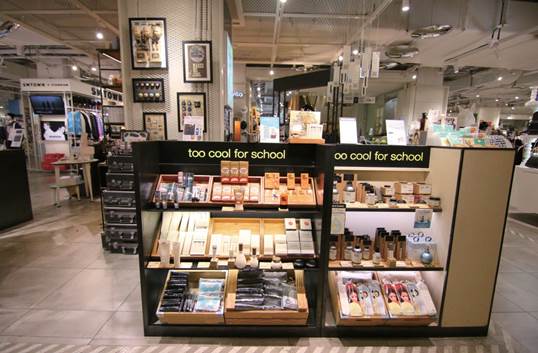 從店面陳設及產品包裝,就讓人感受到歐風時尚設計感的too cool for school,產品形象及包裝由來自紐約及倫敦的藝術家所設計,也是韓國少女族群十分喜愛的美妝品牌之一。