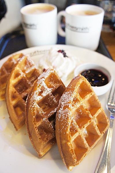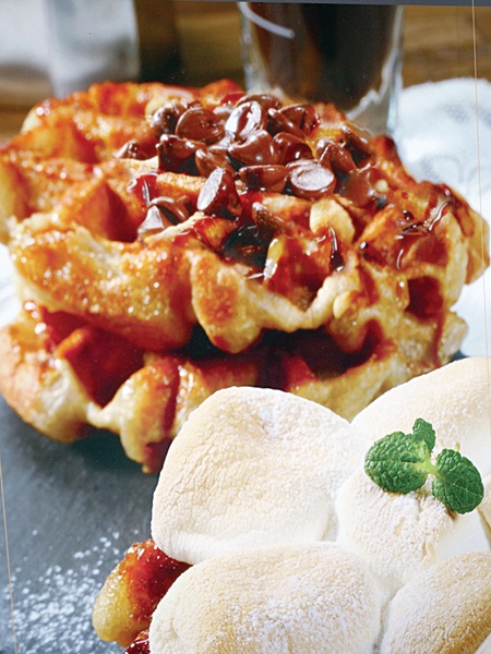 「AND here」最有特色的餐點就是「現烤比利時鬆餅」,烤得酥脆再撒上水滴形狀的巧克力豆,有點融化又保有顆粒 口感;或是加上烘烤後 Q 彈的棉花糖,配 杯咖啡,享受另類追星樂。