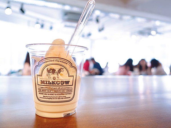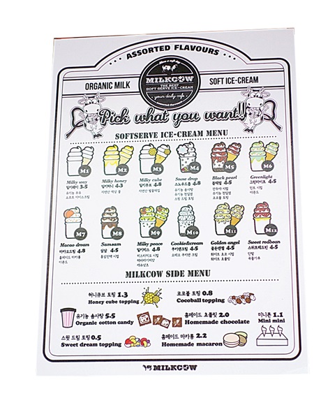 光看這間店的logo, 就讓人覺得一定要品嚐一下牛乳製品才行!「MILKCOW」最引以為傲 的「Milky way」牛奶霜淇淋,採用每日配送到門市的有機牛奶製成,濃郁醇厚,在嘴裡乳香四溢。覺得太單調嗎?別擔心,有 十幾款配料可以自由搭配,最經典的組 合是「Milky cube」,用韓國國內產有 機農蜂蜜製作,現場就擺了一大塊金黃 色的蜂巢!但沒有想像中可怕啦∼吃起來口感酥酥的,甜度頗高,推薦給嗜甜的螞蟻族。不敢嚐試蜂巢的話,也有色 彩繽紛的馬卡龍、棉花糖、巧克力碎片 等,看不懂韓文,看圖片點餐也行。除 了配料的多樣性,可以選擇杯裝、脆皮 餅乾、迷你甜桶餅乾等,搭配出一支專 屬於自己口味的霜淇淋吧!