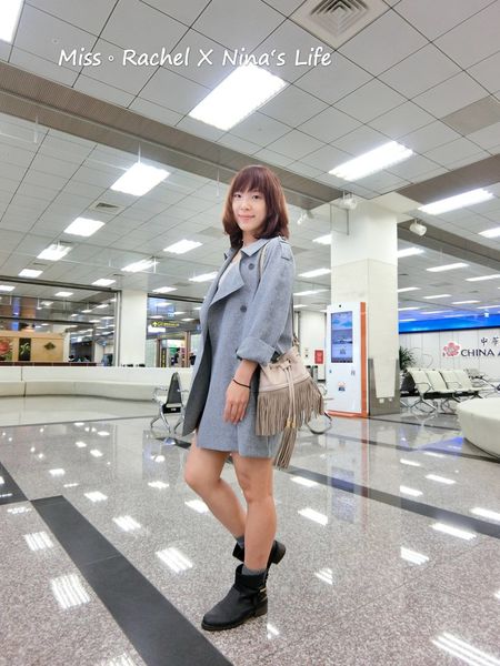 藍色系的長版外套,可以遮蓋到屁股是關鍵,包包是素色不要太花俏都可以