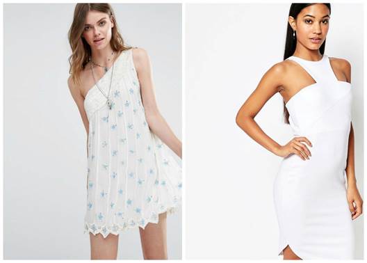 同樣都是白色露肩洋裝,左邊的斜肩碎花洋裝因為材質較軟,挺度較差,即使要價兩萬塊,穿起來也比有剪裁的洋裝吃虧許多。右邊的貼身洋裝因為有剪裁設計,加上布料比較硬挺,一件八百元,卻有兩千塊的質感,甚至超出。