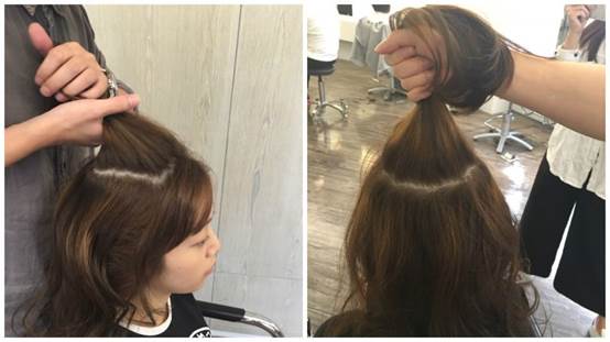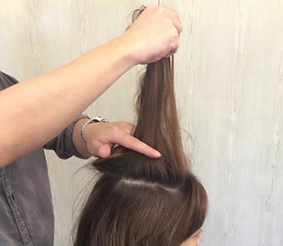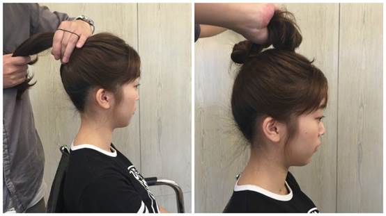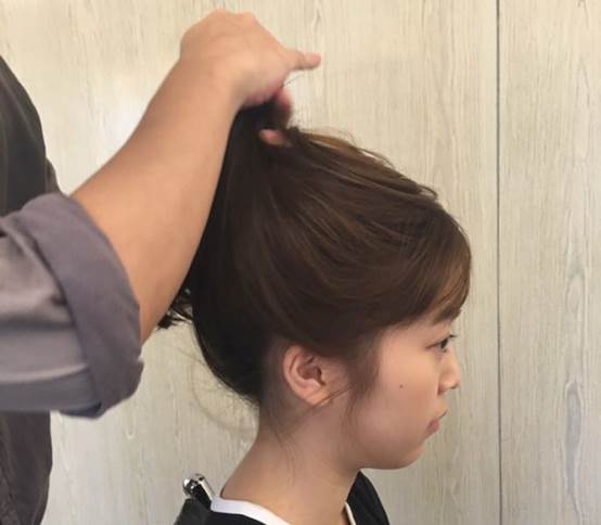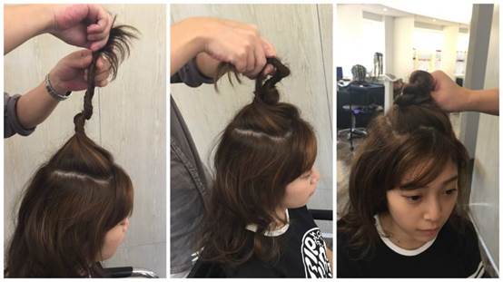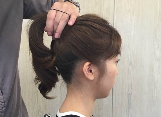 Tips:頭型寬的人,可拉緊頭髮兩側;頭型較尖的可以拉緊頭髮上側