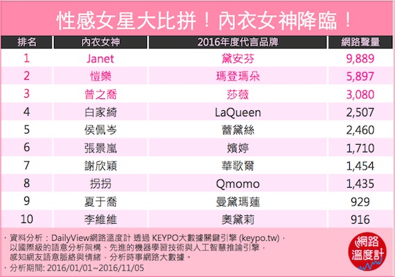 而究竟在2016年有過代言作品的哪一位女星會成為網友們心中的內衣女神呢?就讓今天的DailyView網路溫度計運用《KEYPO大數據關鍵引擎》來告訴你吧!