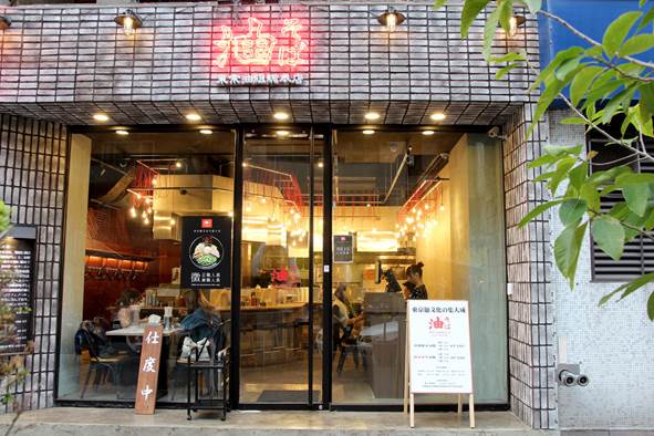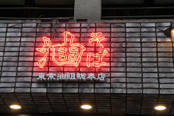 一旁則為一品大廈,油亮的品牌紅色日文漢字「油そば 」霓虹燈招牌高高掛在店外,相當醒目。
