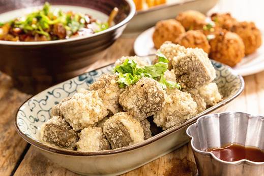 招牌菜色是豆腐丸子、涼拌豆腐、油炸黑白豆腐,假日還會加碼添上藥燉豆腐湯與竹筍湯,在這裡,麵食、粄條反而是配角,是為了豆腐大餐之外的飽足感不夠而準備。豆腐丸子是必點的前3名選項,這道用高溫油炸製做出來的料理完美了酥香脆的形容詞,是用混合各種食材與碎豆腐做成的豆腐團子製成,而油炸黑、白豆腐則簡單一些,黑豆腐是用黑豆製成,裹粉油炸後外觀特殊但依然保有豆香,白豆腐則是原汁原味,手工的製程讓這款原味豆腐吃得出紮實的味道,看著大家寧可乖乖等位子也要吃上一盤豆腐的堅持,終於明白「菜香不怕巷子深」的寓意。