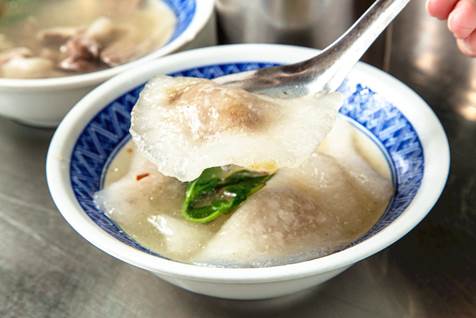 阿蘭姐家的水晶餃好吃到讓人的舌頭跳舞,嫩嫩QQ 的外皮是用樹薯製成的太白粉打成漿後捏糰再包內餡。有別於其他的三角造型,可愛的元寶造型方便食用也帶有吉祥寓意。內餡用了豬絞肉、芹菜以及一些辛香料,絞肉以肥三、瘦七的比例混合,適應了現代人的飲食習慣,油蔥酥的味道很明顯,也是客人喜愛的理由之一。