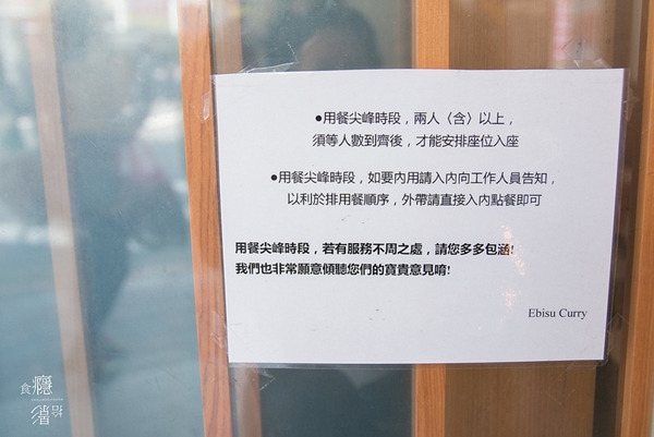 Ebisu咖哩的空間不大,約莫僅有不過15個座位,所以我想這樣的小規定也是合理的,且店內的服務人員態度也都很親切。