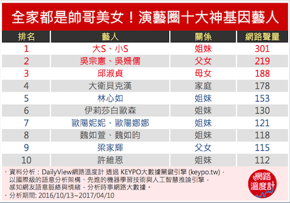 今天的DailyView網路溫度計運用《KEYPO大數據關鍵引擎》找出演藝圈中最受大家歡迎的明星家人們,快一起來看看這些神基因家庭吧!