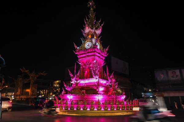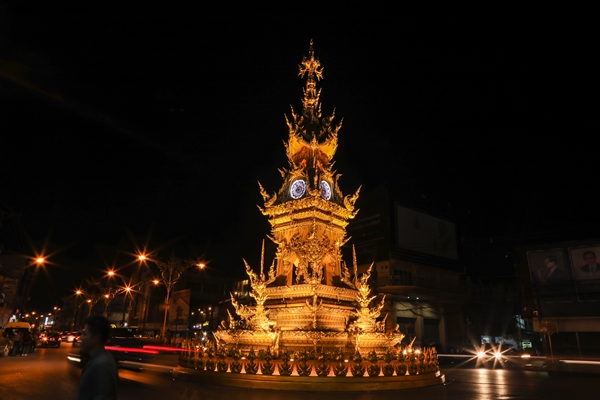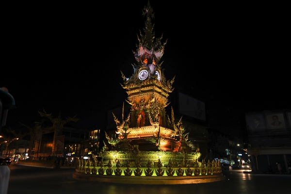 位於清萊市中心的熱門景點鐘塔,豎立於行車路中央,以純金色澤打造,非常矚目,由知名的白廟的主人負責設計。每晚都會隨著音樂轉換,上演著五彩繽紛的燈光秀。
