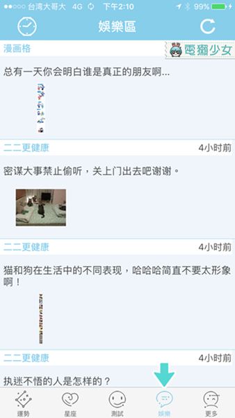 ▼而在「娛樂」的部分,會有一些搞笑有趣的圖文,無聊的話拿來可以笑一下!最右邊的「更多」則是你的個人資料,但其實這個App就算不登入,在使用上也不會有太大影響喔!(除非你想使用付費功能)