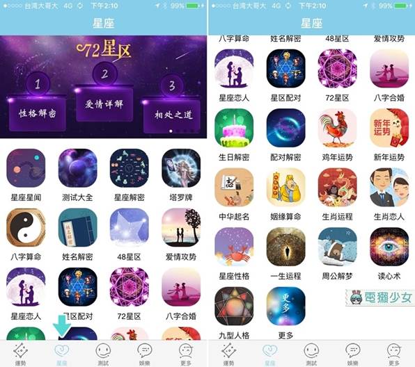 ▼再來我們看看「星座」裡有些什麼呢?結果這裡不只有星座,還有塔羅牌、八字算命、姓名解密等等,但亭伊發現塔羅牌要付費解鎖(大概30元),還有愛情攻勢也要付費
