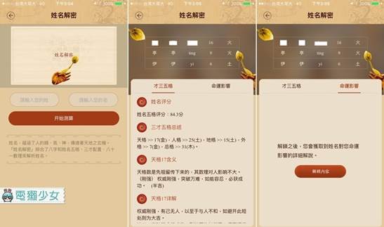 ▼在這邊我們先選個「姓名解密」來測測看囉~它會清楚地用姓名分析你的性格與特質,比如說它就提到亭伊在性格上可能會比較剛毅、像男孩子,這一點的話其實跟我很好的朋友都會發現呢(還滿準的),不過命運影響的部分就要付費解鎖啦