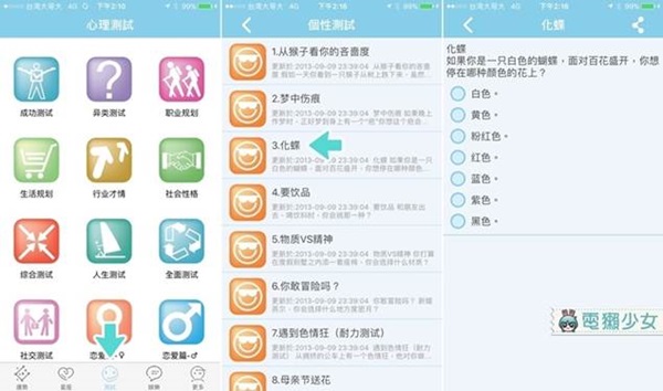 ▼接著我們來看一下「測試」裡面又有什麼吧~先說這些心理測驗都是免費的,光是其中一種主題,裡面就有幾十到一百個以上的測驗,包準讓你玩到翻掉