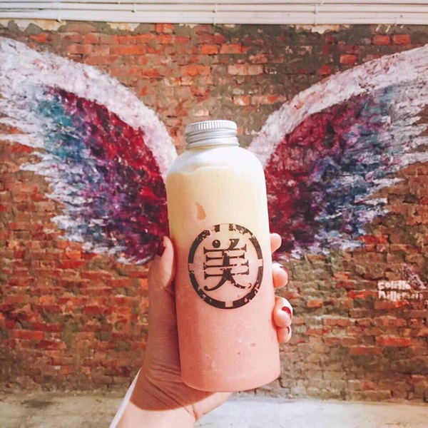 美好年代Belle Époque2店-小美好,邀來美國知名街頭藝術家Colette Miller,在店內的紅磚牆上彩繪了一對彩色翅膀,在IG上掀起一波打卡熱潮。除了這對象徵著愛與希望、力量與勇氣的翅膀外,只在小美好販售的慢磨果汁,也以夢幻的漸層配色讓女孩們忍不住大呼可愛。小美好嚴選慢磨果汁,強調天然新鮮,所有飲品皆不加糖不加水,連冰沙也是由慢磨果汁冰塊製作而成。目前的熱賣口味以綜合葡萄冰沙、紅蘿蔔綜合果汁、綜合西瓜牛奶冰沙為主,接下來會推出季節限定的芒果芭樂汁。想要收集不同顏色的果汁控,可要多留意囉!點此看更多照片
