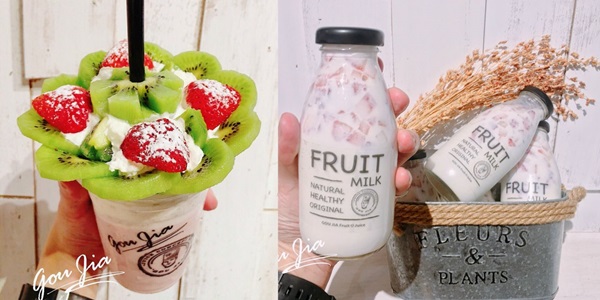 果家gou jia為台語果汁之意,提供新鮮現榨的蔬果汁,打造鮮果飲食的生活概念。除了果汁品項豐富外,果家推出的「雞雞叫系列」更是十足澎湃,例如:「嫁給我好嗎?」是以奇異果作為綻放花朵,底層為草莓奶昔並點綴上草莓裝飾,讓整杯飲品就像捧花一般夢幻。另外還有玻璃瓶裝的限量草莓奶瓶,看得見滿滿的草莓果肉,還可以搭配玉米脆片、燕麥作為早餐,以隱藏限定版限量供應,想吃的人手腳可得加快。點此看更多照片