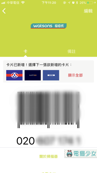 問我為什麼上面右邊把卡片條碼遮住?,第一,倫家不想給你看到人家的會員卡卡號,第二,因為我一把手拿開還來不及截圖它就已經掃描好啦!