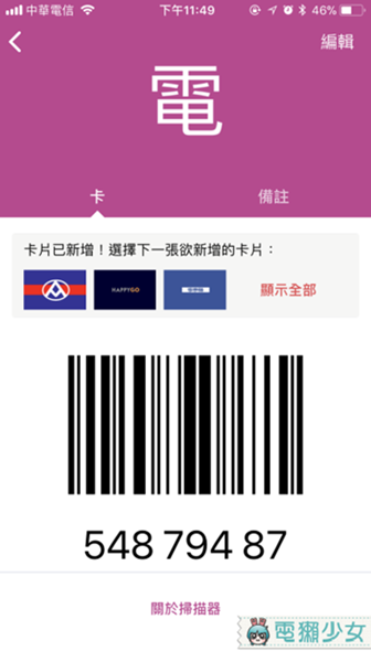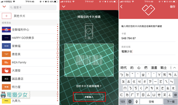 如果找不到你想要新增的店家,或店家實在是太獨特,你也可以自己手動新增喔!從「其他卡片」>>「手動輸入」輸入你要新增的卡號與名稱,他就會自動跑出條碼囉!