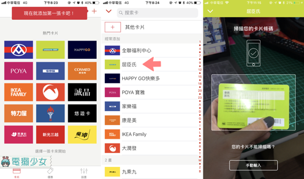 一進去App就先展示出很多「熱門卡片」,如果你有上面列出來的卡片,都可以儲存你的條碼與卡號,先來示範屈臣氏的卡片好了(感覺是每個女孩都會有的一張卡),點選「屈臣氏」,讓他掃描「卡片的條碼」