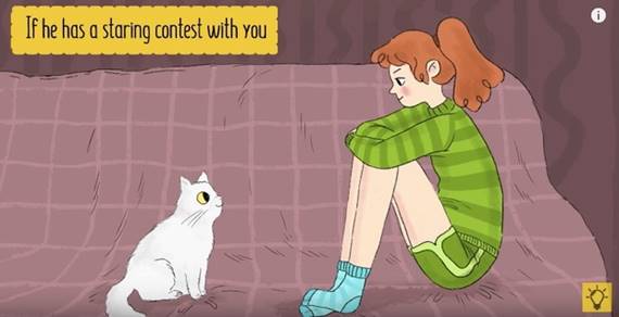 這可能是很多人會怕貓的原因,但貓咪只會盯著有興趣的東西看,對吧?跟你做瞪眼比賽時,表示對你友情與興趣。