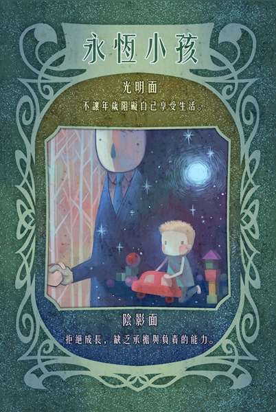 「永恆小孩」代表你藏著拒絕長大的情結。因為長大就不能隨心所欲、只顧自己喜好了,長大要承擔責任、遵從禮教,也意味著你逐漸不再有闖禍的資格,不再能忽略別人的感受。