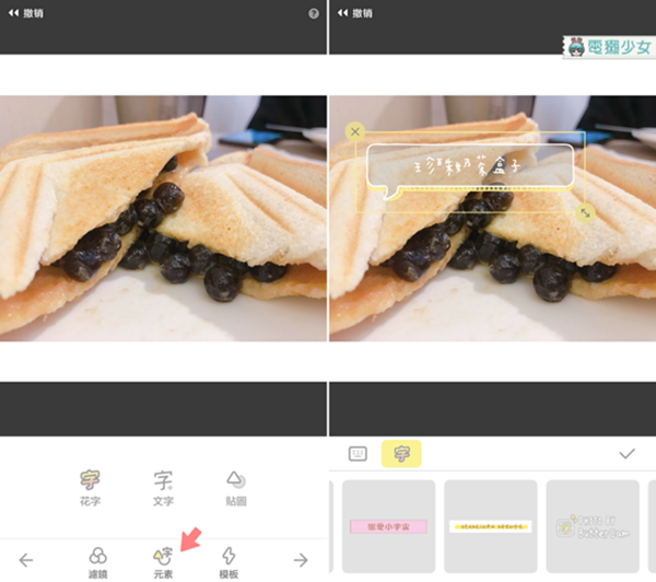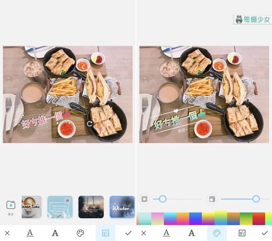 ▼開啟「黃油相機」後在文字元素的地方,有分成比較花俏的(約有30種樣式)跟一般單純文字類的(共有7種字型),宇恩個人是偏好有圖案的路線啦呵呵~不過唯一比較可惜的是它的樣板都是固定的,所以使用者沒有辦法在選完樣式之後對字體的顏色或字型做更動喔!