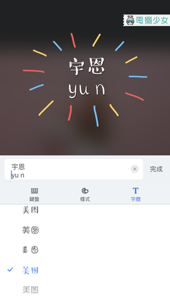▼選完圖案樣式後可以自己調整文字顏色和字型,但…宇恩個人對於美圖秀秀的字型都不是很滿意…而且有時候會大小不一讓我hen崩潰…不過畢竟每個人對美感的要求都不一樣,所以這部分就交給獺友們自己實際用用看囉~