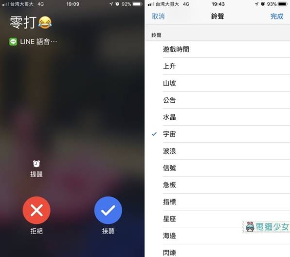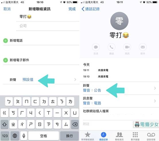 我們會在新增聯絡資訊裡面找到鈴聲跟訊息聲,從這邊就可以幫好友改成特定來電鈴聲啦!!設定好之後要記得按完成才會成功儲存設定,Messenger、WeChat的來電鈴聲也可以一樣可在這邊把個別來電鈴聲改成指定鈴聲,基本上只要會被記錄到通話紀錄的通話,都可以用這個方式來修改來電鈴聲喔!然後詩伊這邊要提供一個Combo技,教你怎麼自製iPhone鈴聲!!