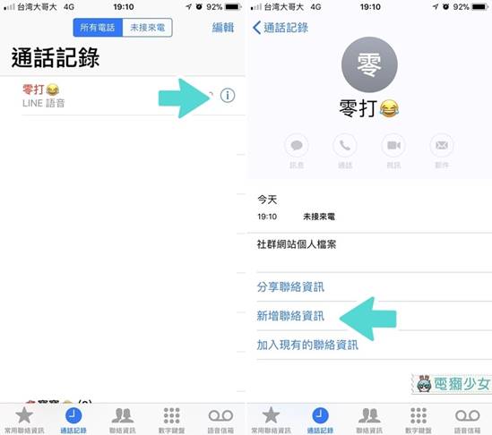 接下來打開手機中內建的電話,在通話紀錄這邊,可以看到LINE語音通話紀錄,想改掉好友的來電鈴聲,就從這邊點進去!!接著點進新增聯絡資訊