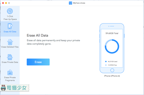 然後呢,旁邊的Erase All Data、Erase Deleted Files等共四個項目,都是要買Pro版本才有的,它是幫助你完全清理乾淨iPhone(因為只選手機重置還是能被有心人士找回檔案),除非你要把iPhone賣掉,不然應該不太需要使用到這些進階功能