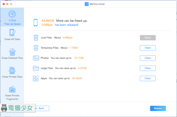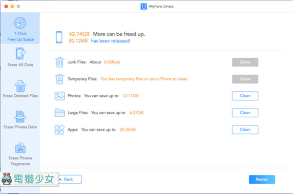 目前Linda手機的剩餘空間是12GB。一共有Junk File、Temporary Files、Photos、Large Files和Apps五個項目可以選擇,按下一鍵清理空間看看有多少容量可以清後,我選擇清除前兩個,也就是垃圾檔案和暫存檔案,加起來竟然也有1G多!
