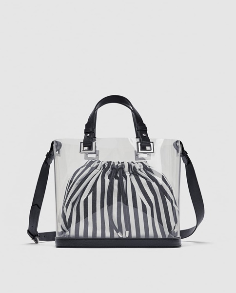 這咖條紋的透明塑膠托特包,也是時尚不敗款喔!