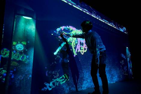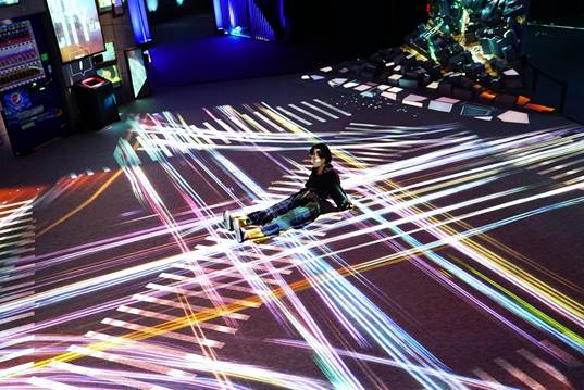 在「光影東京!360°夢幻視覺系特展」中,除了令人驚豔的視覺饗宴外,其中的互動裝置更吸引人,來到原宿區的甜點世界,可以看見糖果雨下在自己的倒影上再俏皮彈開;可以一手觸發東京鳥瞰景,彷彿世界的夜景從此被你開啟;而常見的投幣式飲料機,只要投下一枚硬幣,即啟動整面LED夢幻影像;還有小孩最愛的塗鴉牆,把雙手化作畫筆,盡情放肆塗鴉。