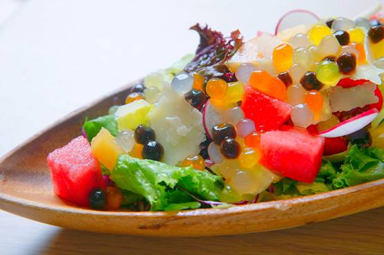 採用特別醃製過的白酒醋及特及初榨的橄欖油,搭上當季的新鮮蔬果和自家自製的繽紛粉圓,以橢圓形的帆船木盤作呈現,彷彿一座美麗的七彩島嶼!