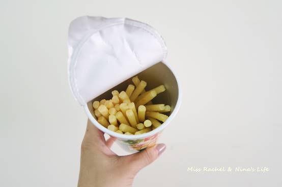 像我買的這兩杯就是比較long、large的口味,吃起來比一般的薯條餅乾真的來得又長又細!只是比較硬一點、但也脆,咬下去會喀滋喀滋的。