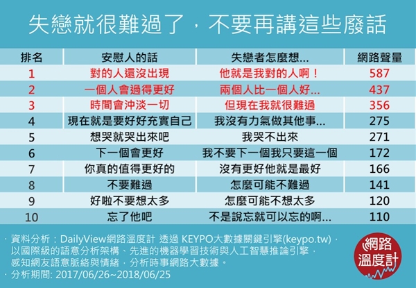 但失戀時身旁的親朋好友們跟你講再多一定都聽不下去,每個人講的都一樣,聽到後面都膩了,到底失戀時安慰別人聽起來最像沒講一樣的是哪句呢?今天DailyView網路溫度計就要透過《KEYPO網路大數據》從2017年06月26日到2018年06月25日間觀察網友在臉書討論、PTT與各新聞媒體、討論區的留言看網友們覺得失戀時被安慰最沒用的是哪句話!