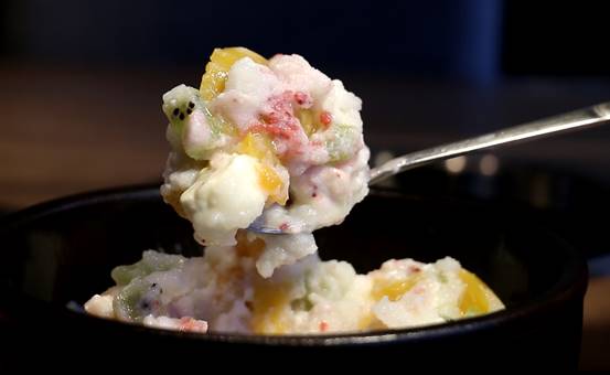 把它全部拌勻後,吃進口裡先是綿綿冰綿密的口感,還有棉花糖的些許甜味,而後就是各式水果的酸甜滋味,很清爽且不會過份甜膩,滿滿一大碗也能跟朋友一同分食,吃完鍋物後,配一碗拌拌冰,替一餐化下個很美好的句點。