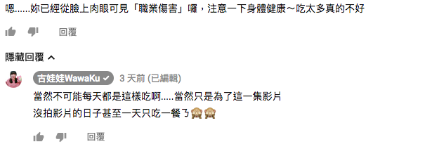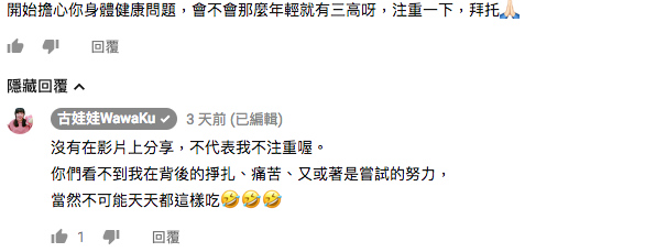不少網友都認為娃娃不拍片時應該好好運動,針對身材的留言越來越多,娃娃也難得回長文,寫下「可能因為你看不到我背後的掙扎與痛苦,每天在食物與討厭運動之間掙扎,更不用說內分泌失調等等…甚至很認真考慮過把頻道關掉,常常想控制飲食,但可能下一餐為了試吃又必須破戒,然後會放棄的想說算了明天再控制,如此重道覆轍。」