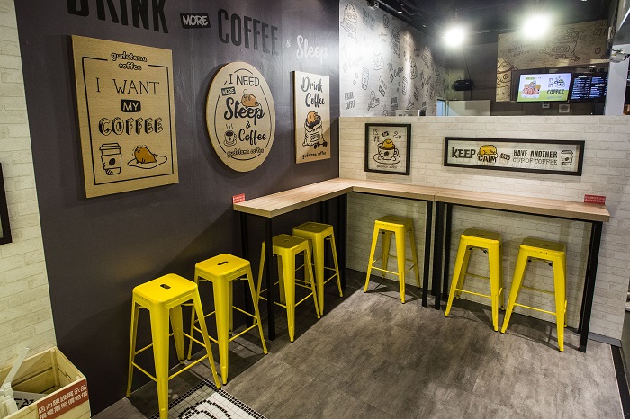 位於咖啡廳入口處就可以看到蛋黃哥慵懶的躺在打翻的咖啡中,店內以白磚牆與木質調色系打造出充滿濃濃的美式藝文風格,並以隨意的手繪筆觸寫著“不想上班的經典語錄”,在等待外帶咖啡的同時,還能拿起手機與不想上班的蛋黃哥來張自拍,期待蛋黃哥做出來的咖啡會不會只有半杯呢?