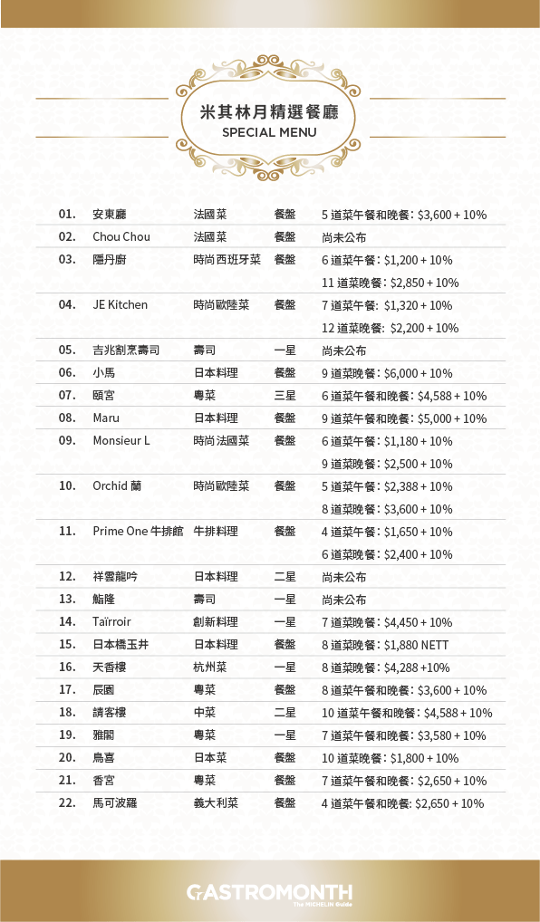 這次參加「米其林月」的經典名單,共 19 間台灣米其林頂級餐廳,其中包含 8 間星級餐廳、11 間米其林餐盤,一起共襄盛舉。