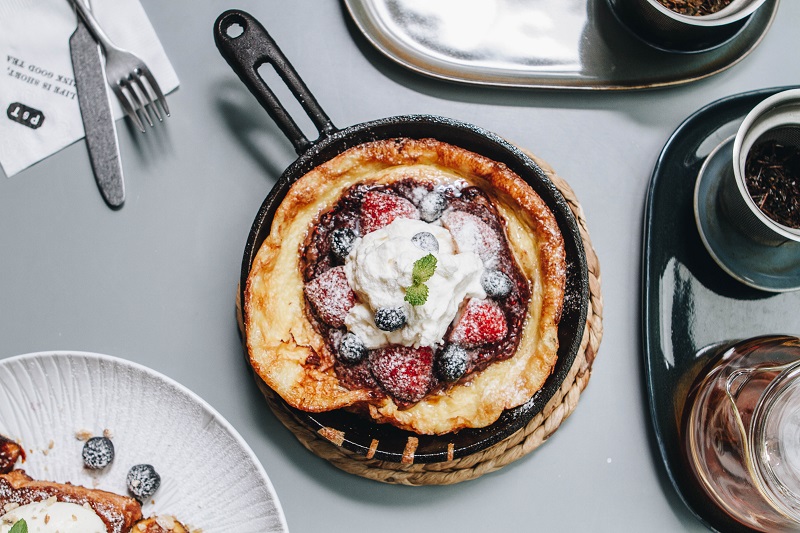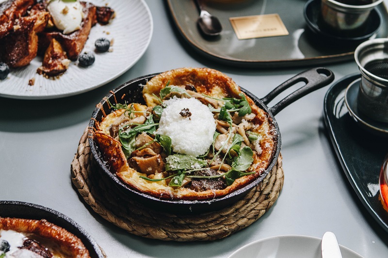 源自於德國的鐵鍋鬆餅(Dutch baby),與過去所熟悉的各式鬆餅不同,藉由奶油撐起麵糊,讓鬆餅在烤箱時膨脹成一個小小的游泳圈,像是在鐵鍋上長出一頂大帽子。出爐時散發濃郁奶油甜香,外圈口感鬆軟,中間有點厚度的地方則是帶點彈性。趁熱擺上配料,讓鬆餅吸收食材風味,咬下滿口奶油香,感覺到餅身的紮實回彈,還有全部搭在一起的溫潤滋味。