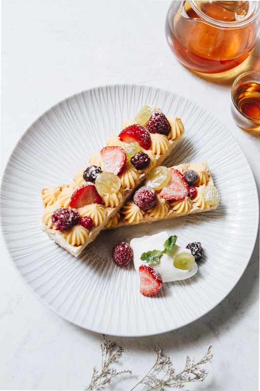經典的法式千層派皮,熟烤後酥皮層次明顯,搭配以香草籽費時製作的法式香草卡士達,還有新鮮莓果的清爽酸甜。紮實的卡士達與輕盈的鮮奶油一起咬入口,令人甜醉於暖暖的卡士達醬和新鮮草莓中。