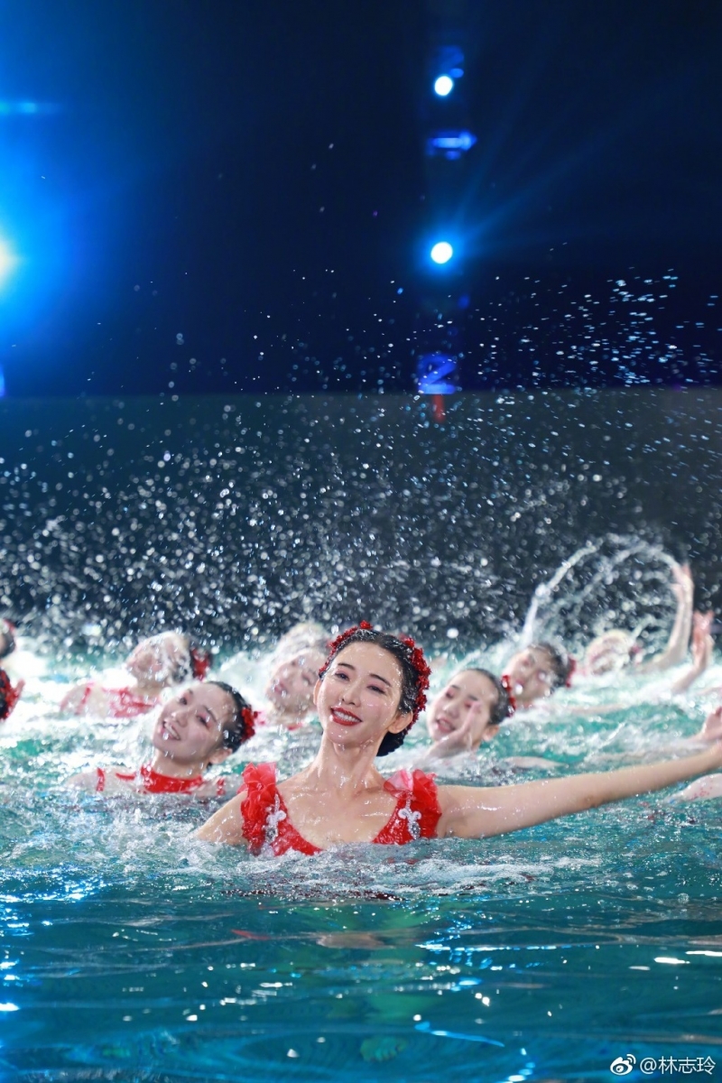 當天晚上,林志玲與武漢漢秀藝術團、湖北省體育局花樣游泳隊、湖南省體育局花樣游泳隊以及遼寧芭蕾舞團一同演出,這也是她人生初次嘗試水上舞蹈,只見她自在穿梭水上水底,還得保持眼睛睜開、維持優雅,怎麼看都是花費無數次的練習,證明姊姊相當敬業的一面。