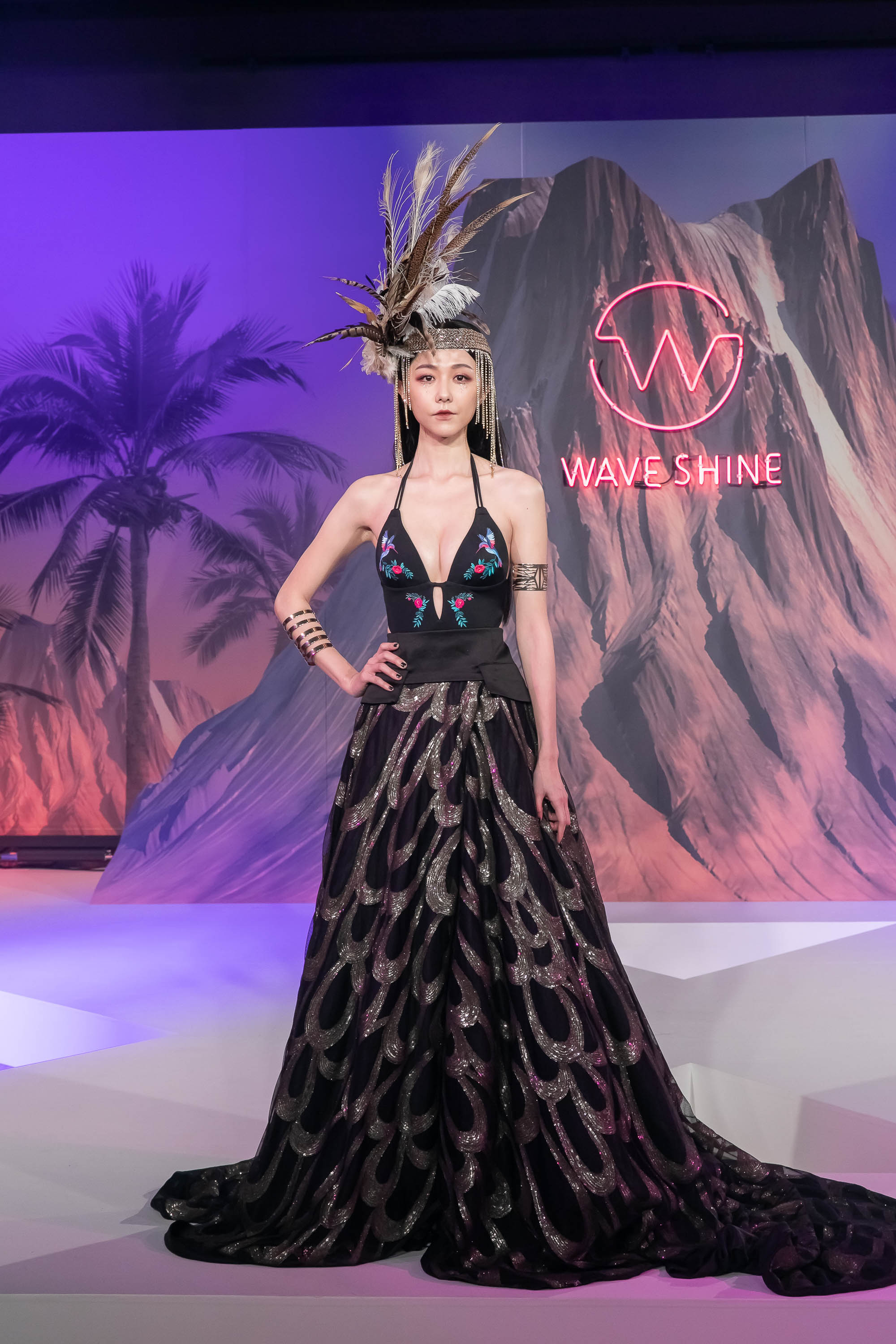 ▲邵雨薇身穿靜謐黑藍雀繡花挖腰連身泳裝及訂製華服,化身夏威夷神秘部落公主壓軸出場。(圖/WAVE SHINE提供)